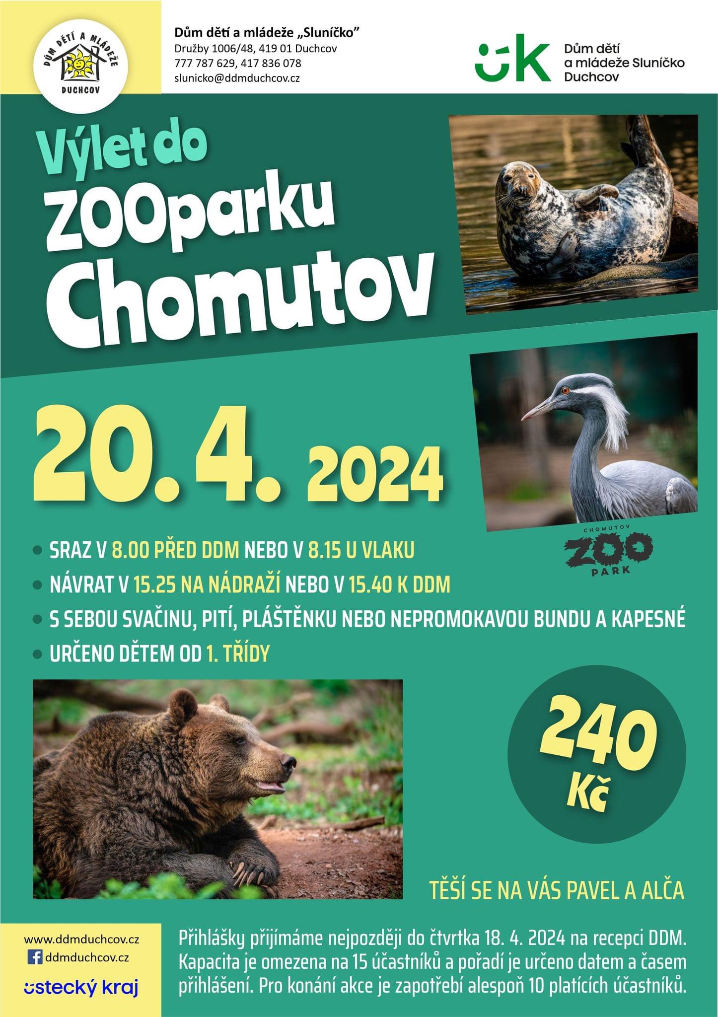 VÝLET DO ZOOPARKU CHOMUTOV 20. 4. 2024, sraz v 8:00 hodin v DDM nebo 8:15 hodin na nádraží ČD Duchcov. Návrat v 15:25 na nádraží ČD Duchcov nebo 15:40 hodin příchod k DDM. - S sebou: svačinu, pití, pláštěnku nebo nepromokavou bundu, kapesné.