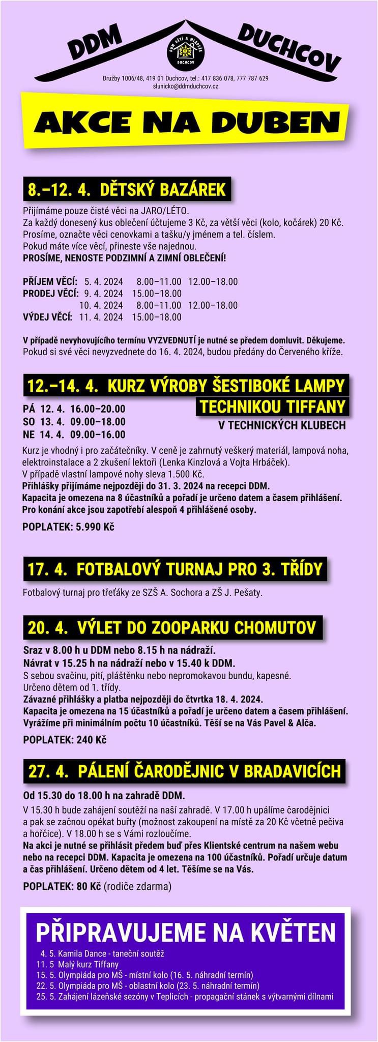 - Podrobné informace naleznete na letácích nebo webu a facebooku DDM Duchcov.