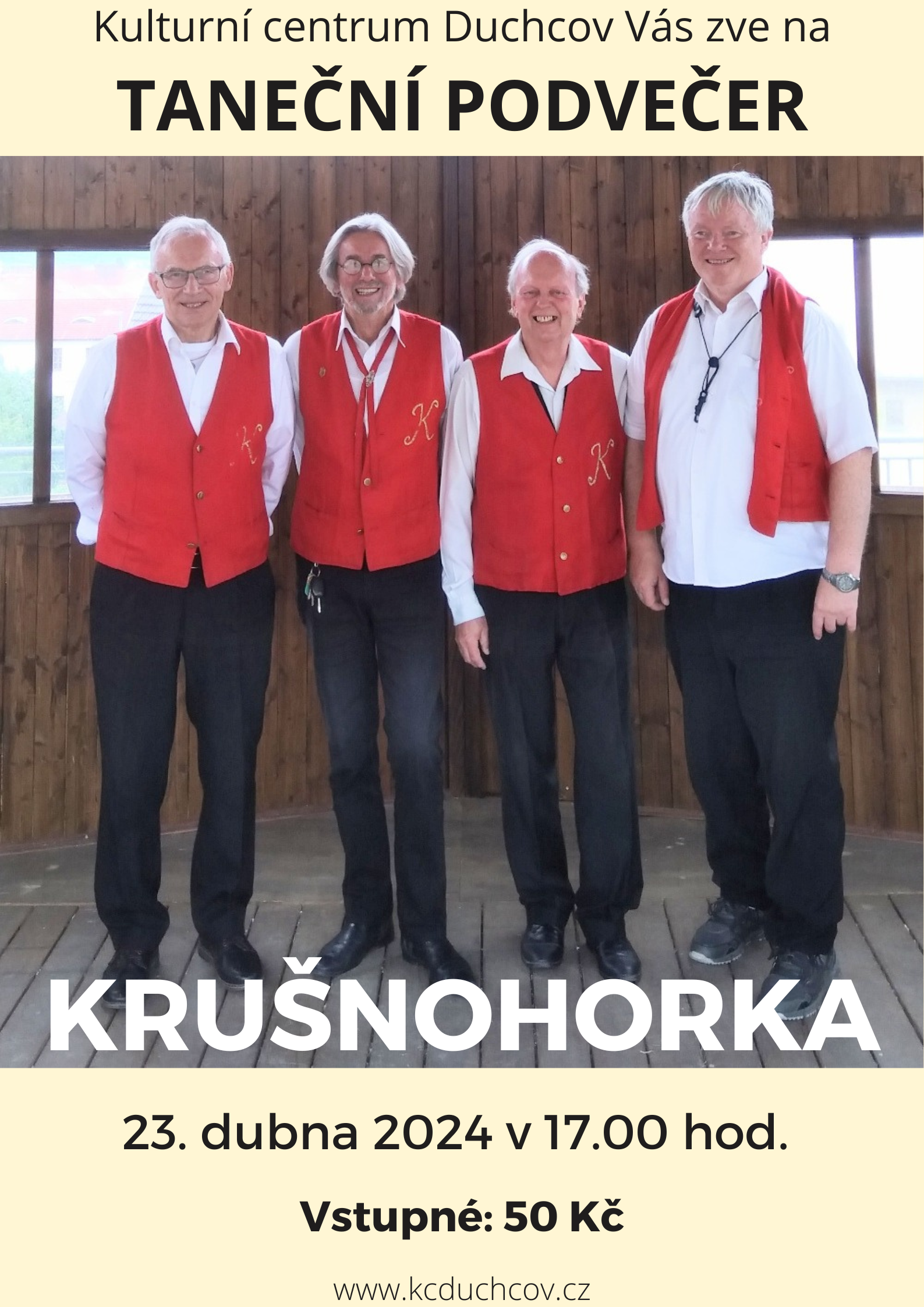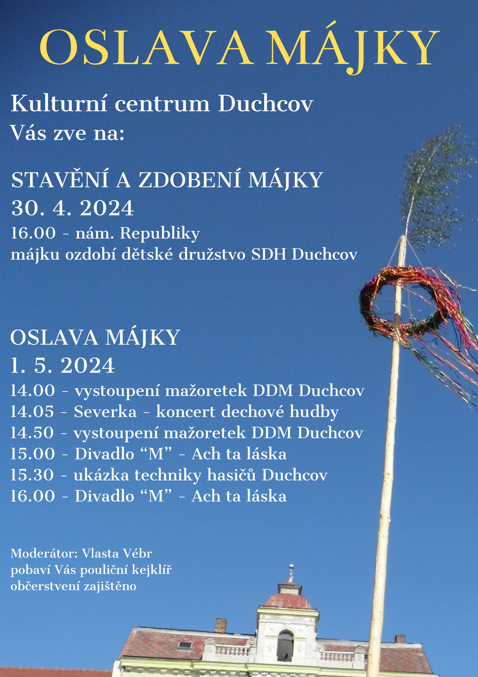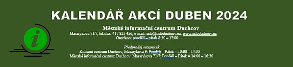 | | | | | | TANEČNÍ PODVEČER S KRUŠNOHORKOU 23. 4. 2024, 17:00 hodin, Kulturní centrum Duchcov, Masarykova 9 | | | | | | | ZASEDÁNÍ ZASTUPITELSTVA MĚSTA DUCHCOVA 25. 4. 2024, 15:00 hodin, Kulturní centrum Duchcov, Masarykova 9 | | | | | | ZDOBENÍ MÁJKY 30. 4. 2024, 16:00 hodin, náměstí Republiky Duchcov - Májku ozdobí dětské družstvo SDH.