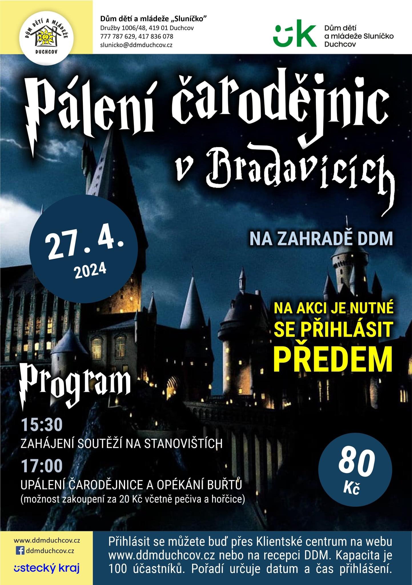 PÁLENÍ ČARODĚJNIC V BRADAVICÍCH 27. 4. 2024, 15:30 – 18:00 hodin, začátek v 15:30 na zahradě DDM Sluníčko Duchcov - Soutěže pro děti, výuka čarodějnického tance, upálení čarodějnice v 17:00 hodin, opékání buřtů (možno zakoupit).