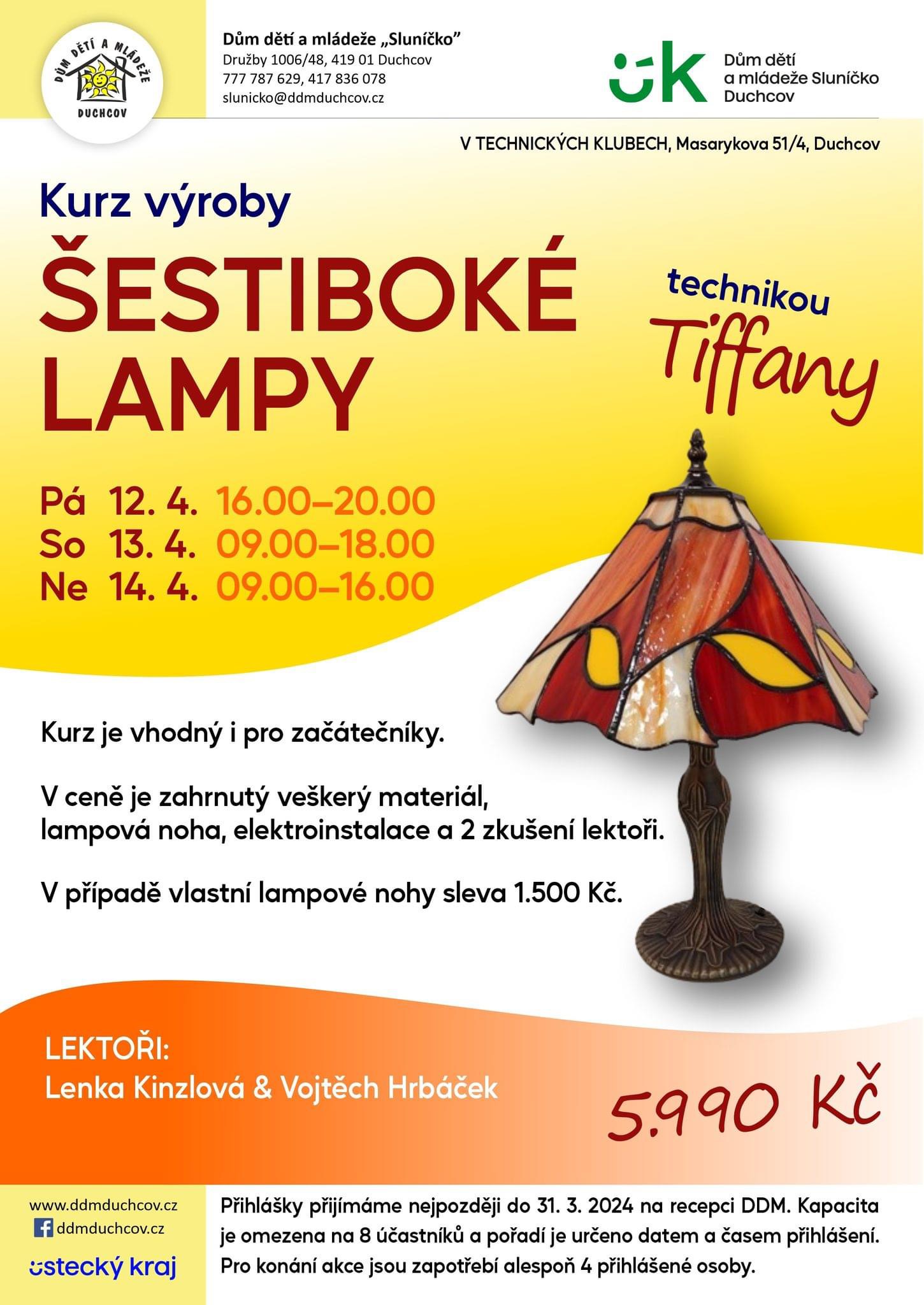 KURZ VÝROBY ŠESTIBOKÉ LAMPY TECHNIKOU TIFFANY 12. 4. – 14. 4. 2024, Technické kluby, Masarykova 51/4 Pátek 12. 4. 16:00 – 20:00 Sobota 13. 4. 9:00 – 18:00 Neděle 14. 4. 9:00 – 16:00 - Kurz je vhodný i pro začátečníky. V ceně je zahrnutý veškerý materiál, lampová noha, elektroinstalace a 2 zkušení lektoři (Lenka Kinzlová a Vojta Hrábček). V případě vlastní lampové nohy sleva 1.500 Kč.