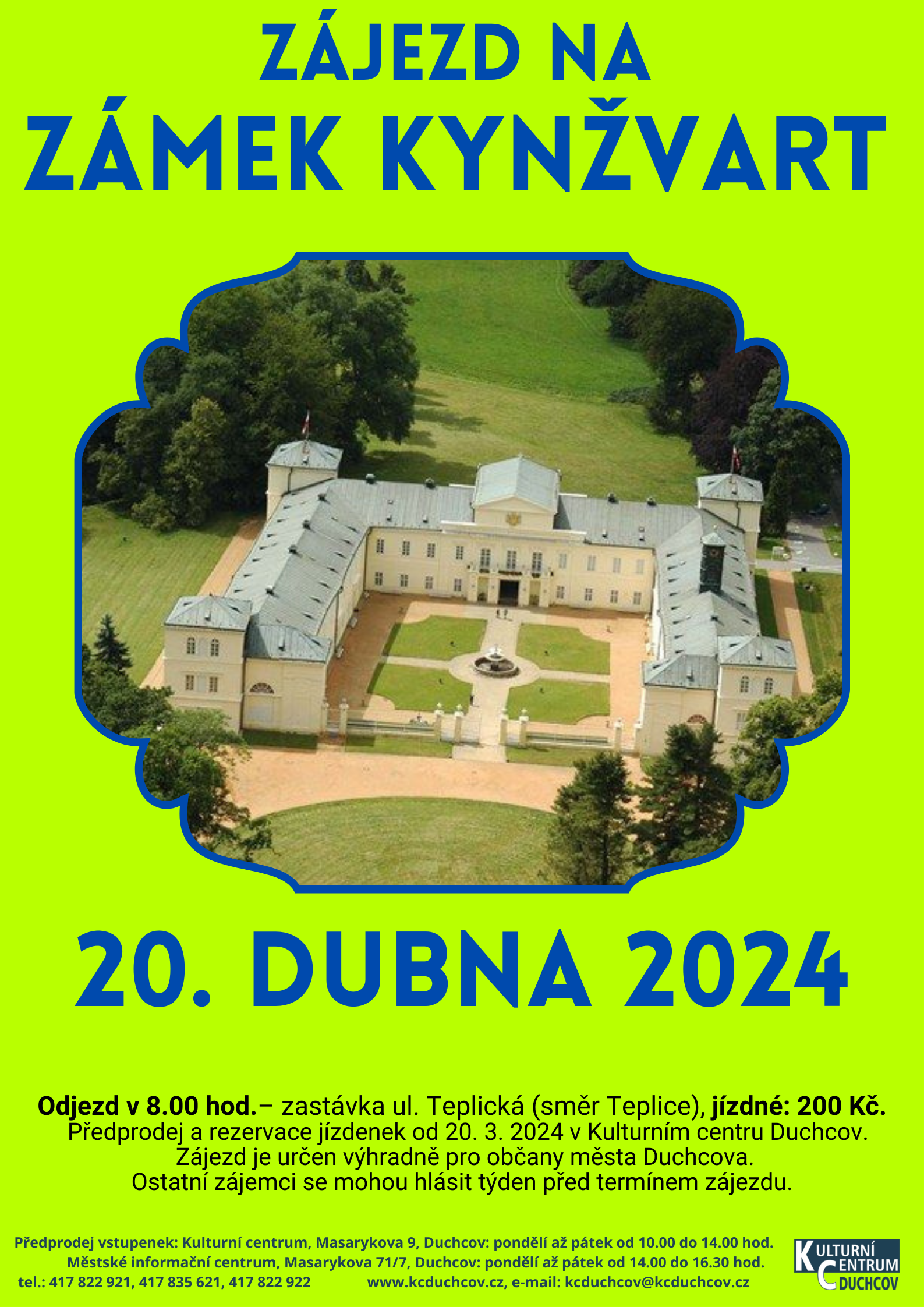 | | | | | | | ZÁJEZD NA ZÁMEK KYNŽVART 20. 4. 2024, odjezd v 8:00 hodin, zastávka ul. Teplická (směr Teplice) - Odjezd v 8:00 hod. – zastávka ul. Teplická (směr Teplice).