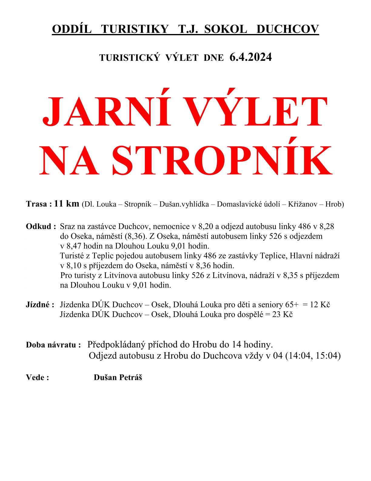 - Doba návratu: předpokládaný příchod do Hrobu do 14 hodiny. Odjezd autobusu z hrobu do Duchcova vždy v 04 (14:04, 15:04)