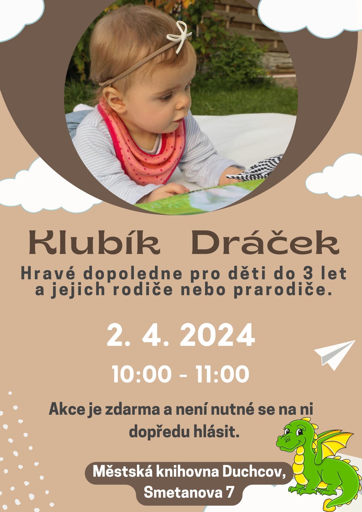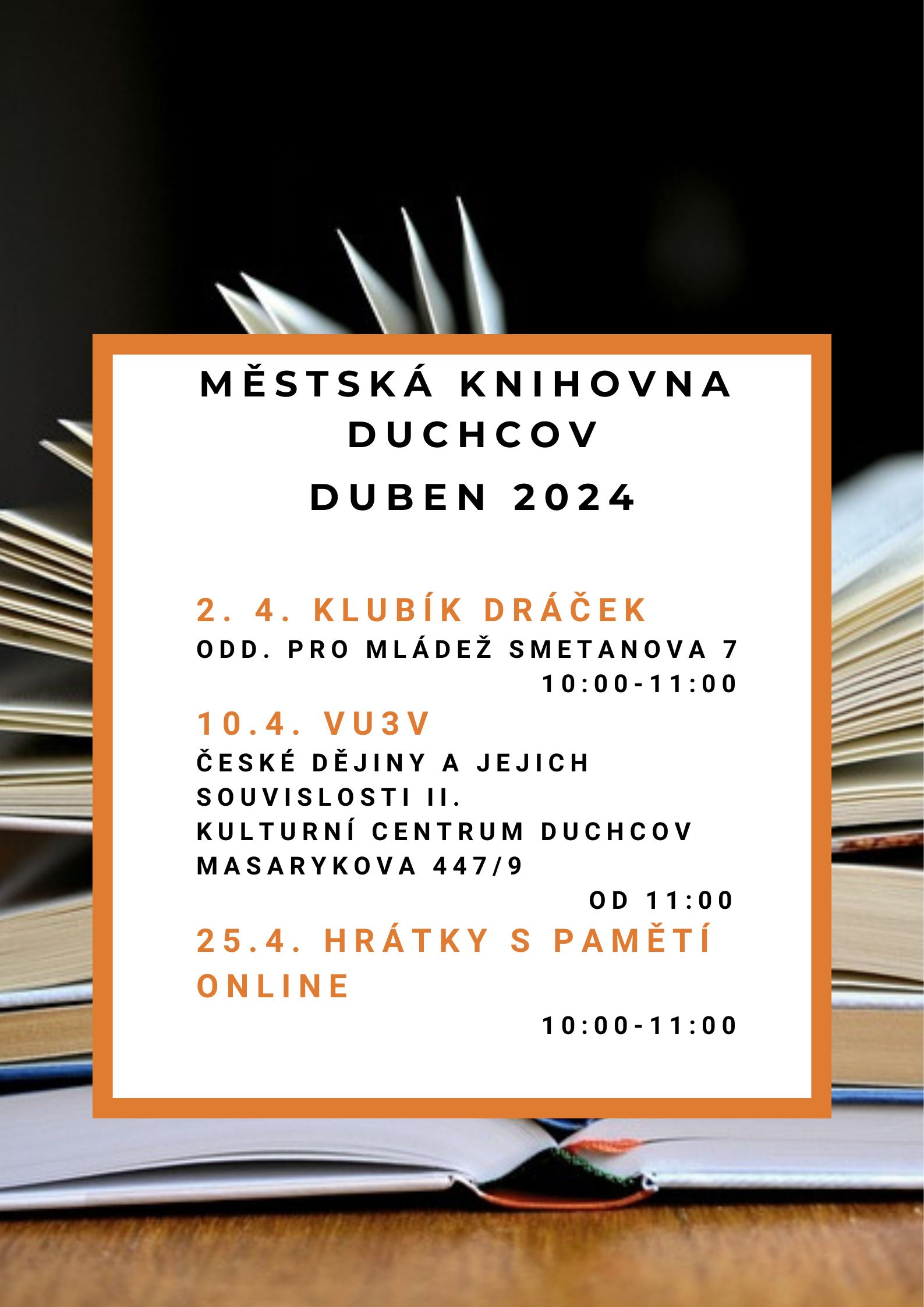 KLUBÍK DRÁČEK 2. 4. 2024, 10:00 – 11:00 hodin, oddělení pro mládež, Smetanova 7 VIRTUÁLNÍ UNIVERZITA TŘETÍHO VĚKU ČESKÉ DĚJINY A JEJICH SOUVISLOSTI II. 10. 4. 2024, od 11:00 hodin, Kulturní centrum Duchcov, Masarykova 9 HRÁTKY S PAMĚTÍ PRO SENIORY – ONLINE 25. 4. 2024, 10:00 – 11:00 hodin, online | | | | | EXPOZICE – JÁ GIACOMO CASANOVA | | | | | | EXPOZICE – HISTORIE MĚSTA DUCHCOVA | | | | | | | EXPOZICE – KOČÁRKY A DĚTSKÁ VOZIDLA Z DUCHCOVA | | | | | | OBRÁZKY S PŘÍBĚHEM 26. 2. – 23. 4. 2024, Poppelova výstavní síň Muzea města Duchcova, Masarykova 71/7 - Výstava obrazů Eduarda Bárty.