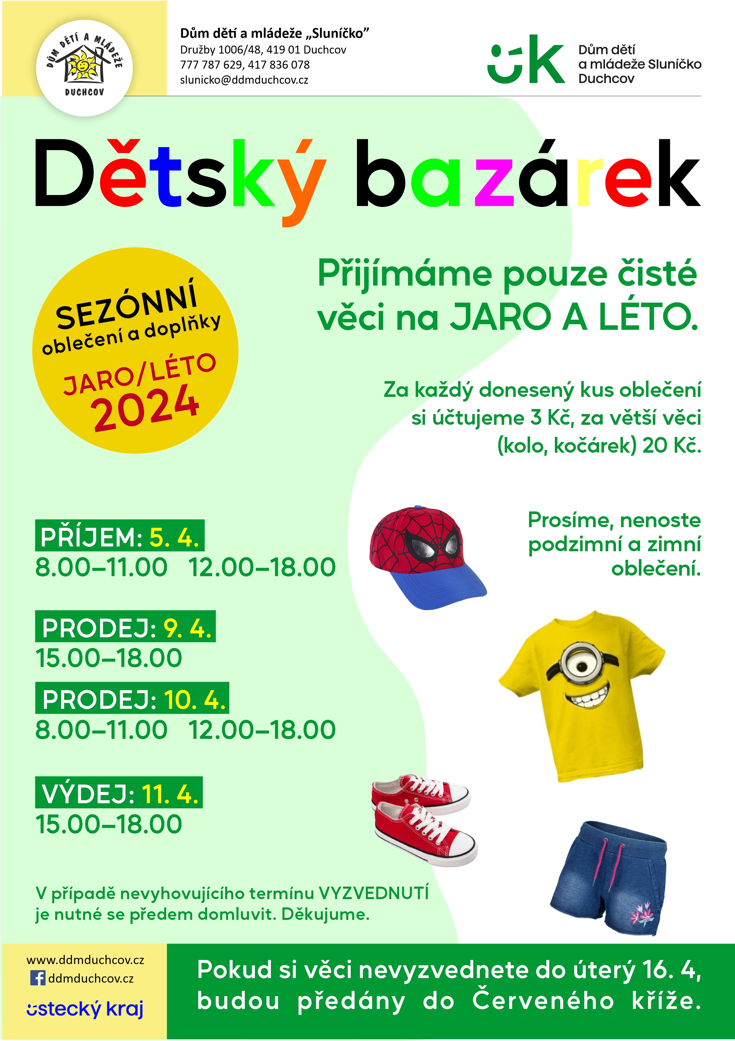 | | | | DĚTSKÝ BAZÁREK Oblečení a doplňky JARO/LÉTO 2024 5. 4. – 11. 4. 2024, Dům dětí a mládeže „Sluníčko“ Duchcov PŘÍJEM: 5. 4. 2024 8:00 – 11:00; 12:00 – 18:00 PRODEJ: 9. 4. 2024 15:00 – 18:00 10. 4. 2024 8:00 – 11:00; 12:00 – 18:00 VÝDEJ: 11. 4. 2024 15:00 – 18:00 - V případě, nevyhovujícího termínu VYZVEDNUTÍ je nutné se předem domluvit.