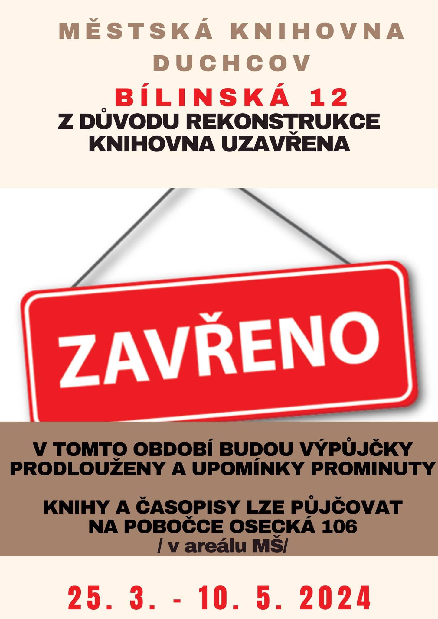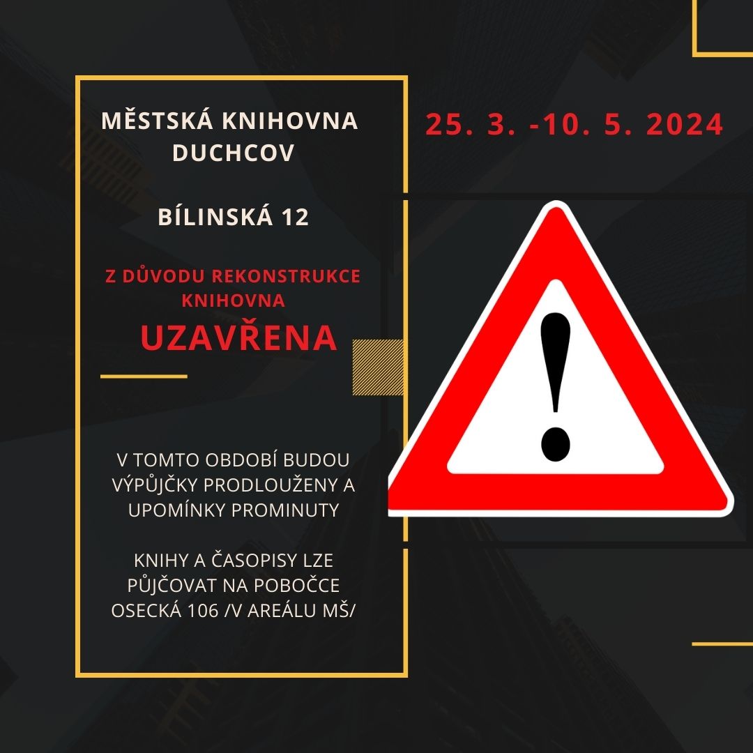 | | | | | | Z DŮVODU REKONTRUKCE KNIHOVNA BÍLINSKÁ 12 – UZAVŘENA 25. 3. - 10. 5. 2024 - V tomto období budou výpůjčky prodlouženy a upomínky prominuty.