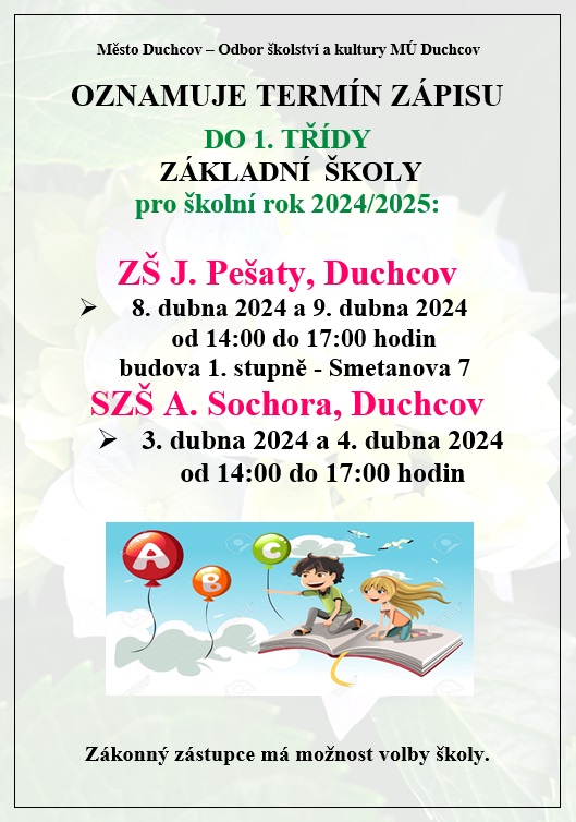 ÚČAST NA TUR. POCHODU SE SEVEREM NA JEDLOVOU 20. 4. 2024 | | | | ZÁPIS DO 1. TŘÍDY ZÁKLADNÍ ŠKOLY PRO ŠKOLNÍ ROK 2024/2025 ZŠ J. PEŠATY, DUCHCOV 8. 4. a 9. 4. 2024, 14:00 – 17:00 hodin, budova I. stupně – Smetanova 7 SZŠ A. SOCHORA, DUCHCOV 3. 4. a 4. 4. 2024, 14:00 – 17:00, Teplická 13 | | | | UKLIĎME DUCHCOV 6. 4. 2024, sraz v 9:00 hodin na Teplické ulici na chodníku u Automyčky - V rámci celorepublikové akce „Ukliďme Česko“ se místní úklidová akce uskuteční v sobotu 6. dubna 2024.